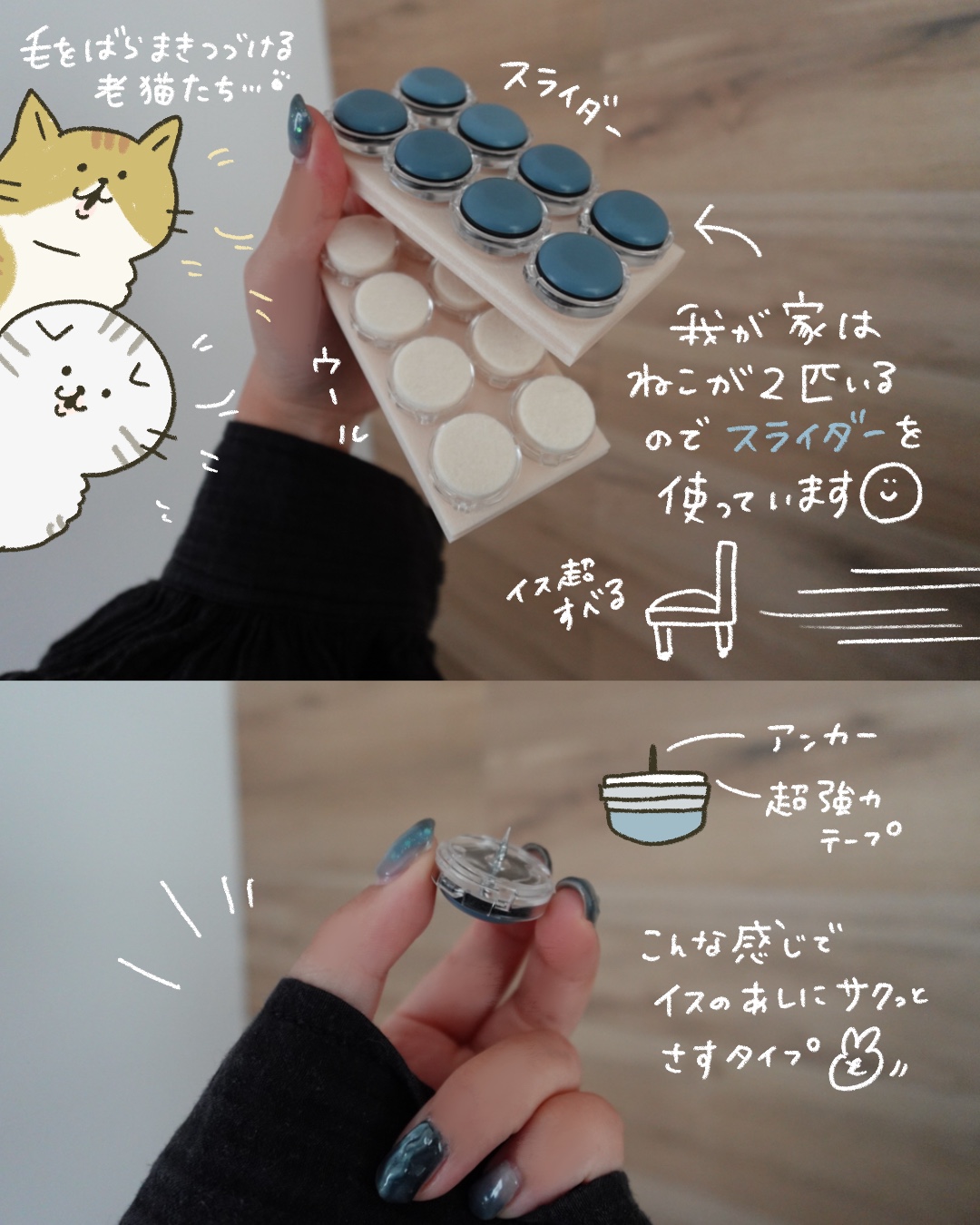靴下タイプやフェルトタイプのように、椅子脚にほこりや猫毛が溜まったりしないし