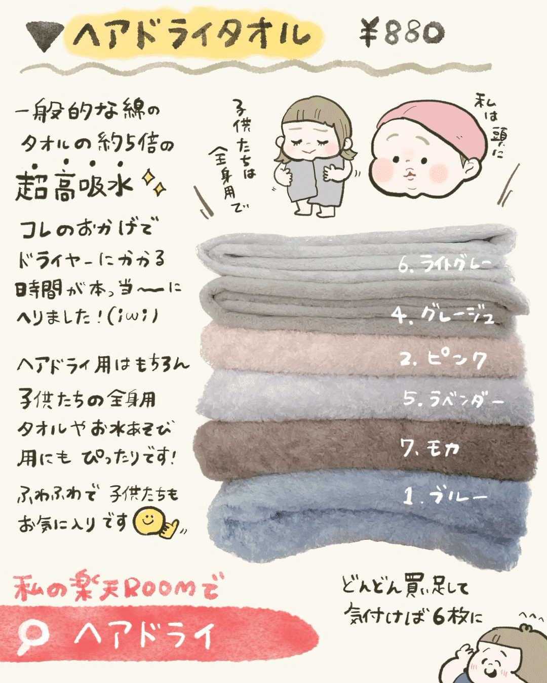ヘアドライ用としてはもちろん、子供たちの全身用タオルやお水あそび用にもぴったり!ふわふわで子供たちもお気に入りです👶 カラーも豊富で可愛くて、どんどん買い足して気づけば我が家には6枚もあります(笑)