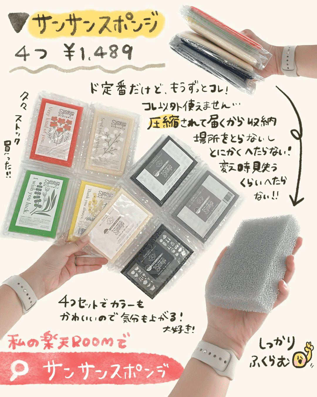 圧縮されてペチャンコで届くからストックの収納場所をとらないし、水につけるとしっかり膨らみます。 そして何より「変え時を見失うくらいへたらない」!!コスパ最強の大好きアイテムです。