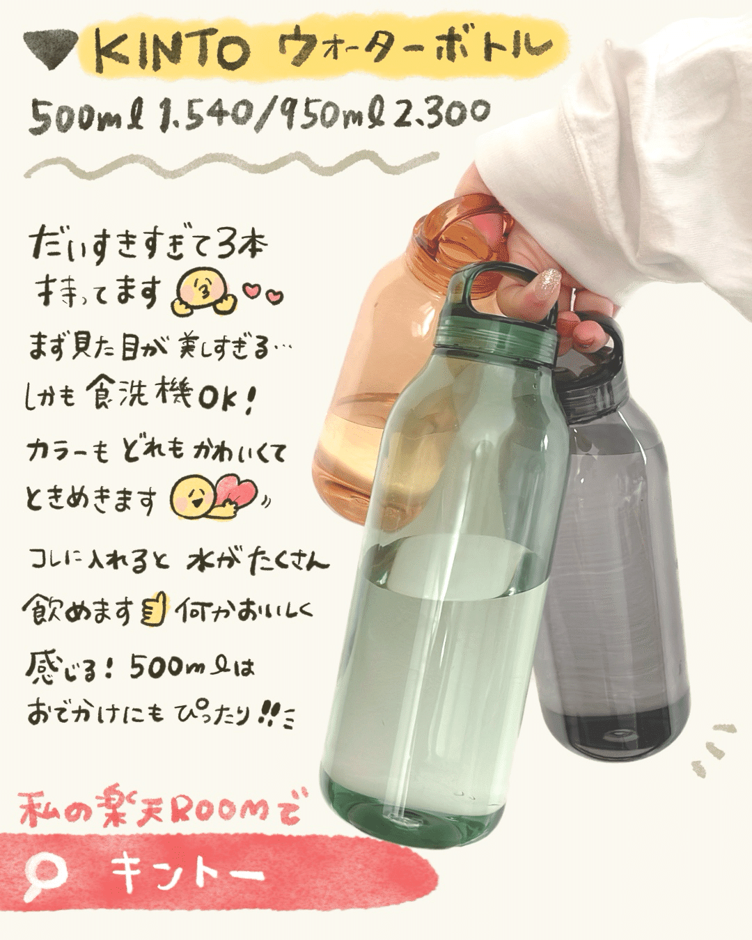 KINTO (キントー) WATER BOTTLE ウォーター ボトル 500ml 水筒 ボトル タンブラー おしゃれ シンプル KINTO ハンドル 持ち手 アウトドア 水 お茶 仕事 ウォーターボトル ドライブ マイボトル 500の方はお出かけ用に! 透明度が高いので水がキラキラ光って本当に綺麗♡ 持ってるだけで上がります🙎‍♀️ 食洗機OK room.rakuten.co.jp