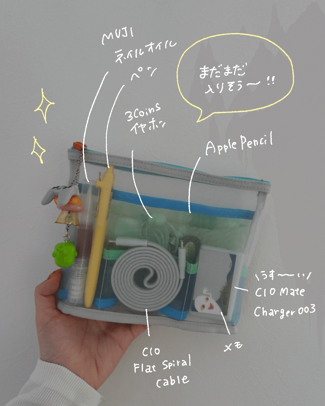 これだけ入れても、まだ少し余裕があるくらい! 中が透けて見えるので、「あれ、ケーブルどこいった?」とポーチの中をガサガサ探すストレスがなくなりました。